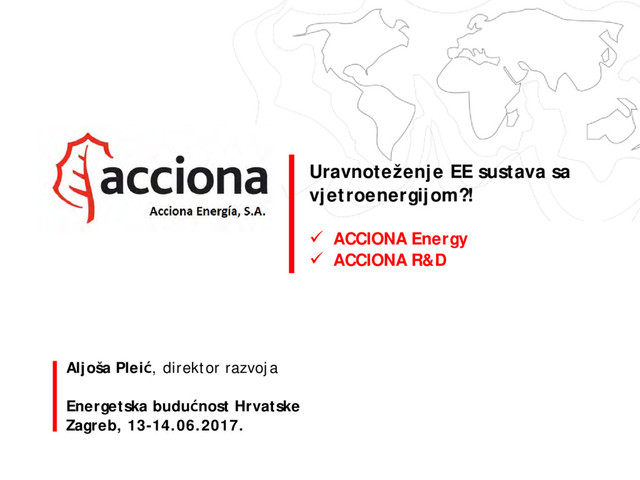 ACCIONA uravnoteženje ACCIONA, dana 28/02/2016 je postala prva tvrtka širom svijeta koja nudi dodatnu energiju vjetra za uravnoteženje elektroenergetskog sustava, po zahtjevu REE, kada pokriva tehnička ograničenja na prijenosnim vodovima. 2.000 MW alocirano! ACCIONA Energy S.A. - 4.800 MW ACCIONA Green Energy department ACCIONA Renewable energy Control Center (CECOER) 3.500 MW cilj do 2020! Povećanje umjesto smanjenja MWh! Zahtjev Operatora!
