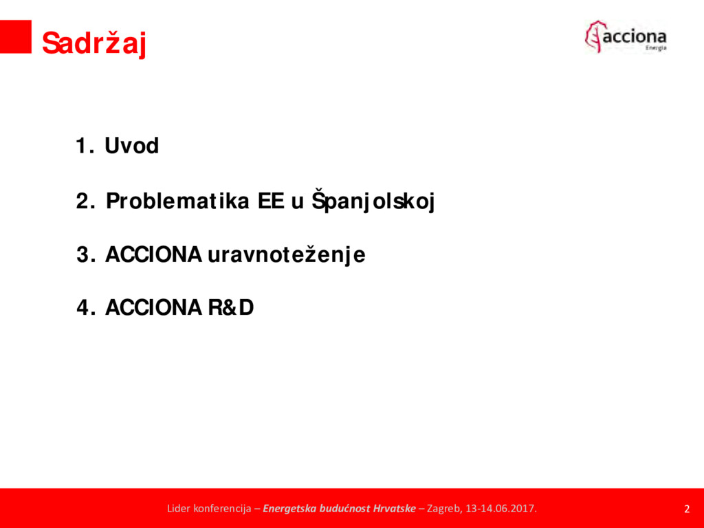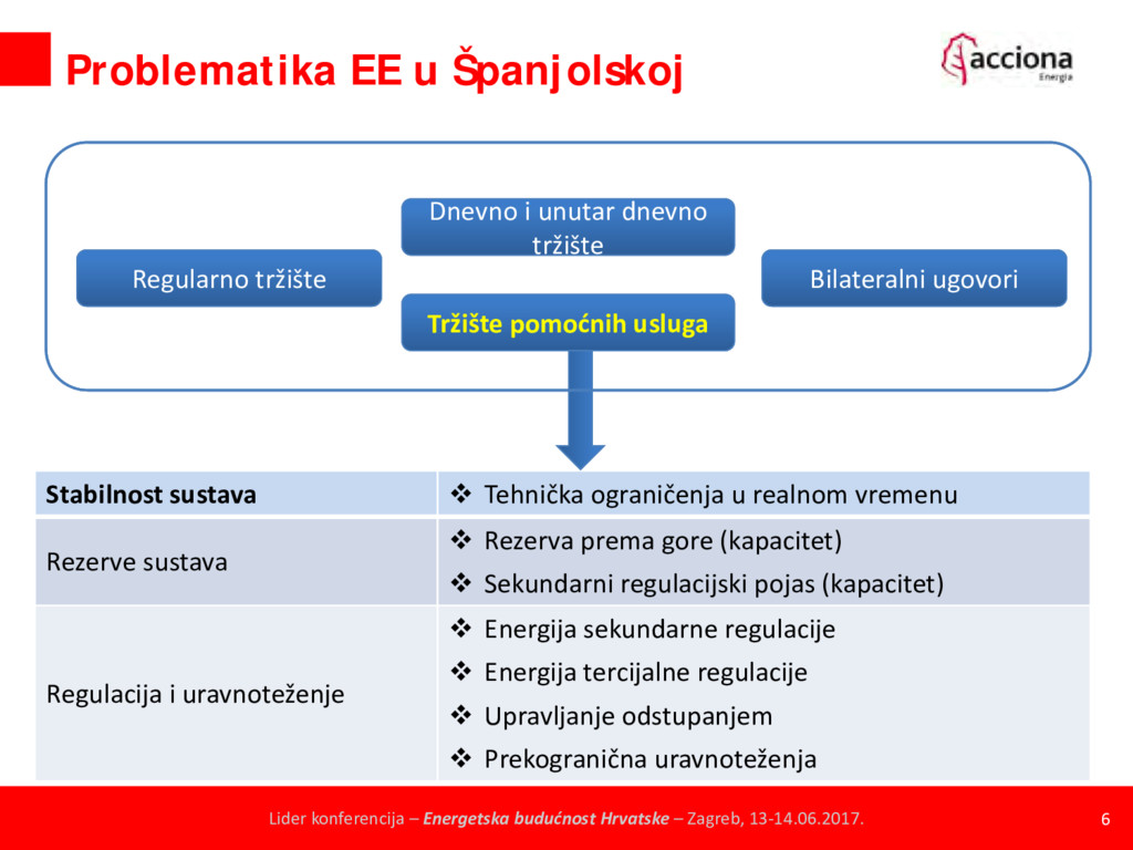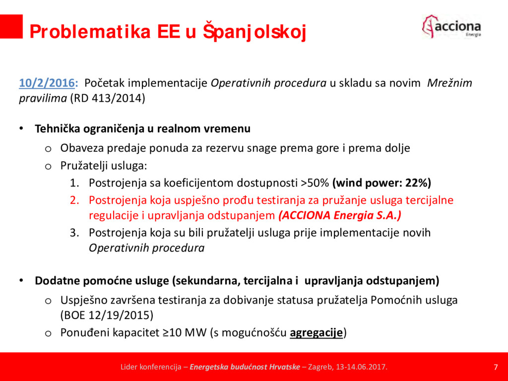 Problematika EE u Španjolskoj 10/2/2016: Početak implementacije Operativnih procedura u skladu sa novim Mrežnim pravilima (RD 413/2014) • Tehnička ograničenja u realnom vremenu o Obaveza predaje ponuda za rezervu snage prema gore i prema dolje o Pružatelji usluga: 1. Postrojenja sa koeficijentom dostupnosti >50% (wind power: 22%) 2. Postrojenja koja uspješno prođu testiranja za pružanje usluga tercijalne regulacije i upravljanja odstupanjem (ACCIONA Energia S.A.) 3. Postrojenja koja su bili pružatelji usluga prije implementacije novih Operativnih procedura • Dodatne pomoćne usluge (sekundarna, tercijalna i upravljanja odstupanjem) o Uspješno završena testiranja za dobivanje statusa pružatelja Pomoćnih usluga (BOE 12/19/2015) o Ponuđeni kapacitet ≥10 MW (s mogućnošću agregacije)