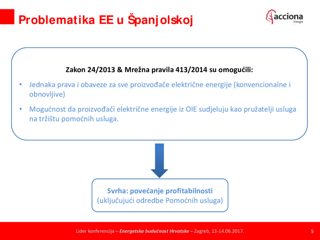 Problematika EE u Španjolskoj Zakon 24/2013 & Mrežna pravila 413/2014 su omogućili: • Jednaka prava i obaveze za sve proizvođače električne energije (konvencionalne i obnovljive) • Mogućnost da proizvođači električne energije iz OIE sudjeluju kao pružatelji usluga na tržištu pomoćnih usluga. Svrha: povećanje profitabilnosti (uključujući odredbe Pomoćnih usluga)