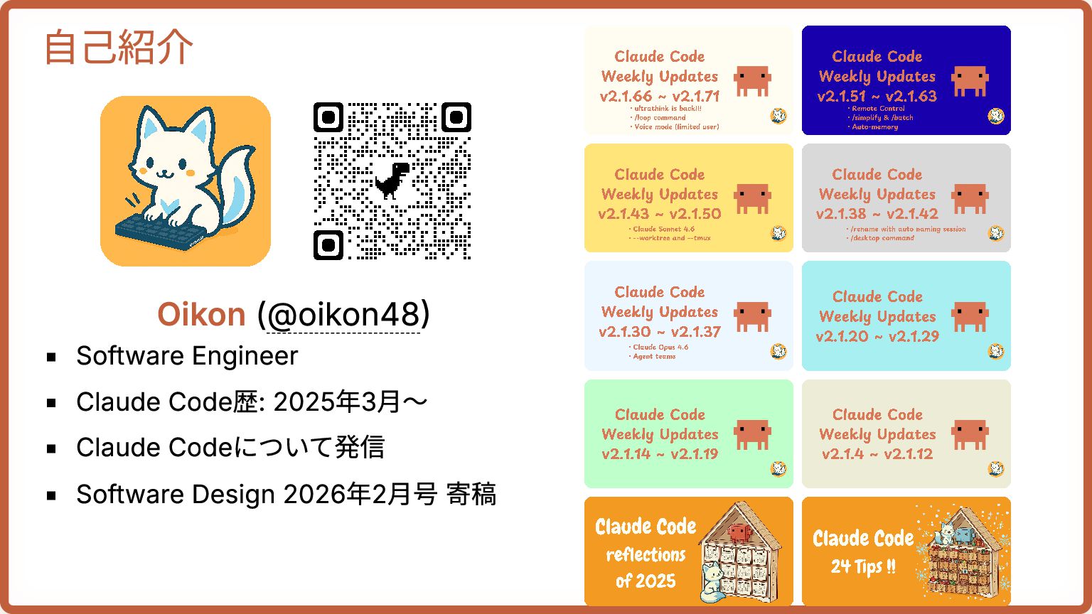 Haiku 高速・安価、ファイル発見に十分 単純編集 Haiku 1ファイル変更、明確な指示 複数ファイル実装 Sonnet コーディング最適バランス 複雑なアーキテクチャ Opus 深い推論が必要 PRレビュー Sonnet コンテキスト理解 + ニュアンス検出 セキュリティ分析 Opus 見逃しは許されない ドキュメント作成 Haiku 構造はシンプル 90%はSonnetでOK。Opusは設計判断・セキュリティ・5+ファイル変更時