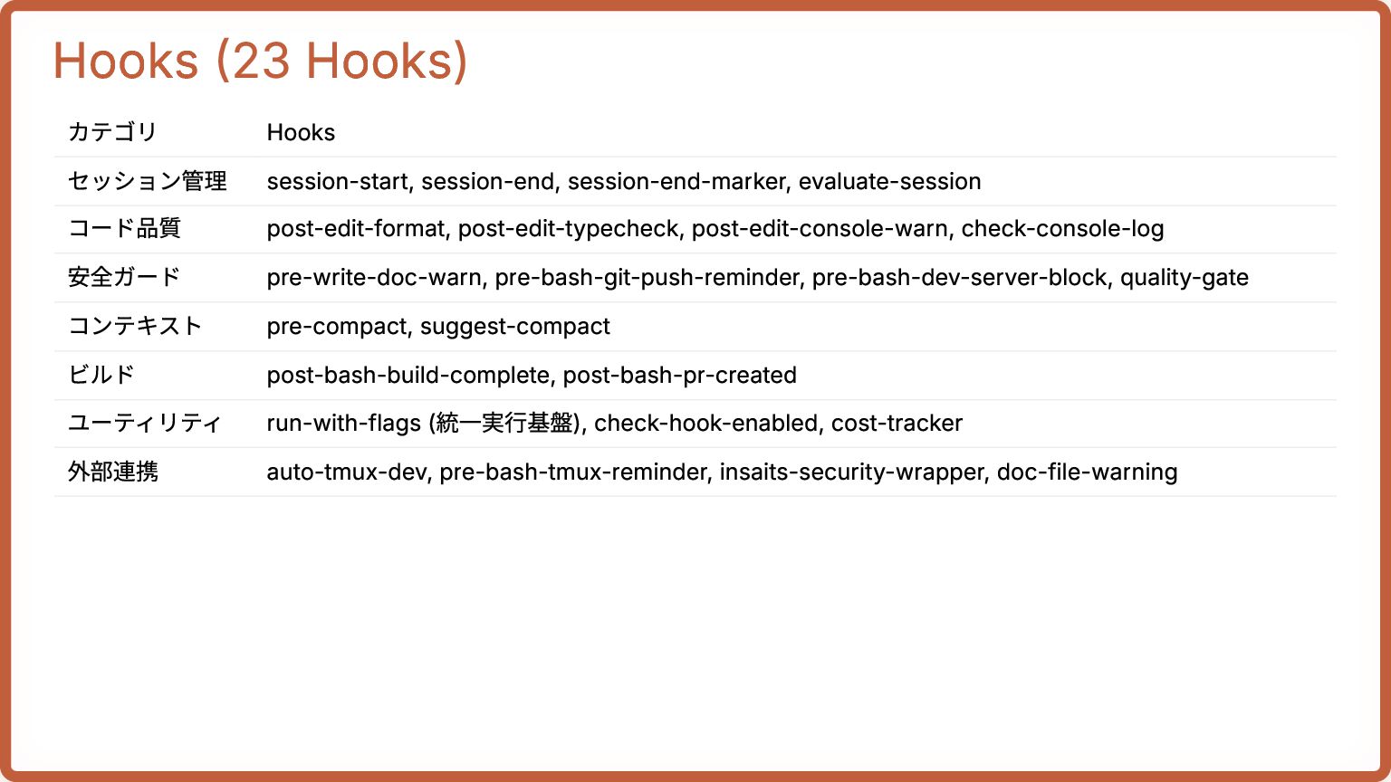 コード品質 post-edit-format, post-edit-typecheck, post-edit-console-warn, check-console-log 安全ガード pre-write-doc-warn, pre-bash-git-push-reminder, pre-bash-dev-server-block, quality-gate コンテキスト pre-compact, suggest-compact ビルド post-bash-build-complete, post-bash-pr-created ユーティリティ run-with-flags (統一実行基盤), check-hook-enabled, cost-tracker 外部連携 auto-tmux-dev, pre-bash-tmux-reminder, insaits-security-wrapper, doc-file-warning