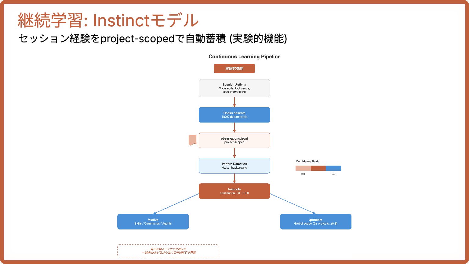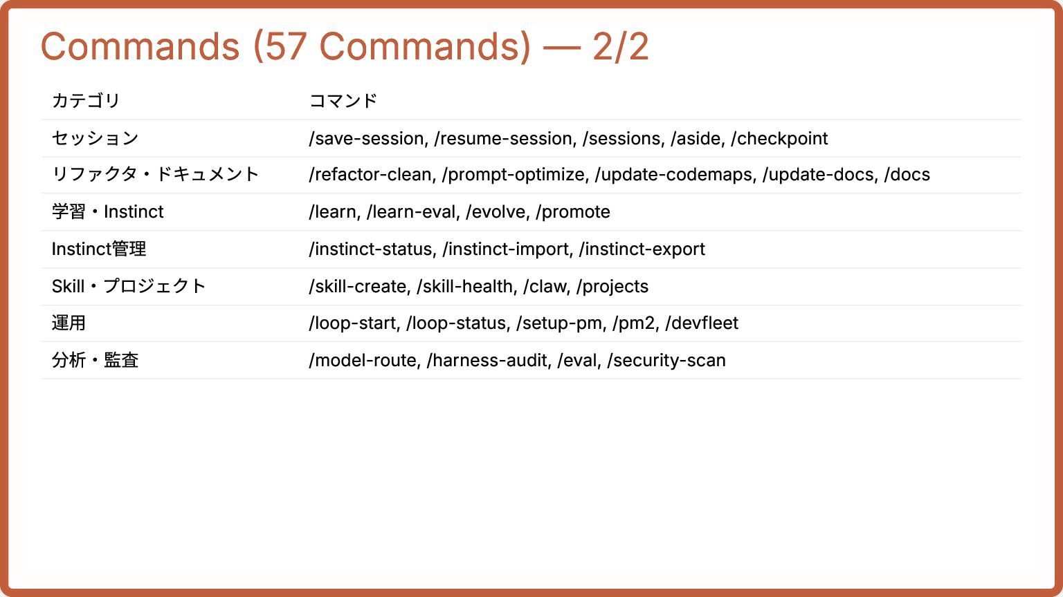 /sessions, /aside, /checkpoint リファクタ・ドキュメント /refactor-clean, /prompt-optimize, /update-codemaps, /update-docs, /docs 学習・Instinct /learn, /learn-eval, /evolve, /promote Instinct管理 /instinct-status, /instinct-import, /instinct-export Skill・プロジェクト /skill-create, /skill-health, /claw, /projects 運用 /loop-start, /loop-status, /setup-pm, /pm2, /devfleet 分析・監査 /model-route, /harness-audit, /eval, /security-scan