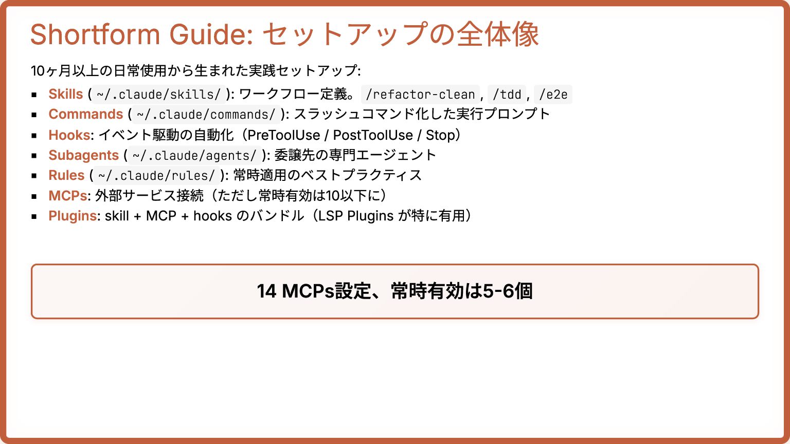 , /tdd , /e2e Commands ( ~/.claude/commands/ ): スラッシュコマンド化した実行プロンプト Hooks: イベント駆動の自動化(PreToolUse / PostToolUse / Stop) Subagents ( ~/.claude/agents/ ): 委譲先の専門エージェント Rules ( ~/.claude/rules/ ): 常時適用のベストプラクティス MCPs: 外部サービス接続(ただし常時有効は10以下に) Plugins: skill + MCP + hooks のバンドル(LSP Plugins が特に有用) 14 MCPs設定、常時有効は5-6個
