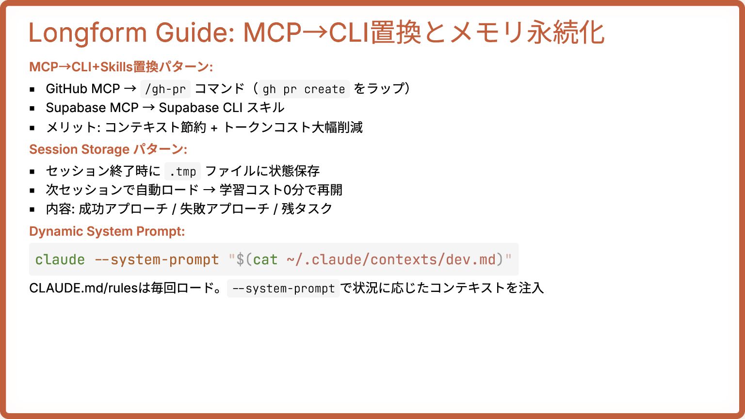 pr create をラップ) Supabase MCP → Supabase CLI スキル メリット: コンテキスト節約 + トークンコスト大幅削減 Session Storage パターン: セッション終了時に .tmp ファイルに状態保存 次セッションで自動ロード → 学習コスト0分で再開 内容: 成功アプローチ / 失敗アプローチ / 残タスク Dynamic System Prompt: CLAUDE.md/rulesは毎回ロード。 --system-prompt で状況に応じたコンテキストを注入 claude --system-prompt "$(cat ~/.claude/contexts/dev.md)"