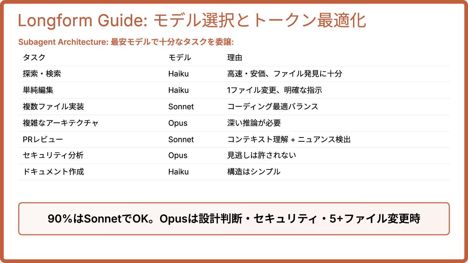 12. Longform Guide: モデル選択とトークン最適化 Subagent Architecture: 最安モデルで十分なタスクを委譲: タスク モデル 理由 探索・検索