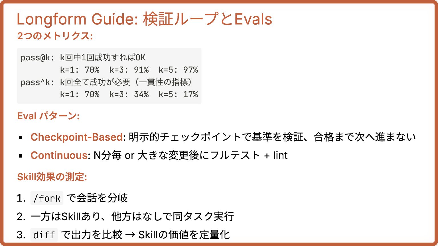 13. Longform Guide: 検証ループとEvals 2つのメトリクス: Eval パターン: Checkpoint-Based: 明示的チェックポイントで基準を検証、合格まで次へ進まない Continuous: N分毎