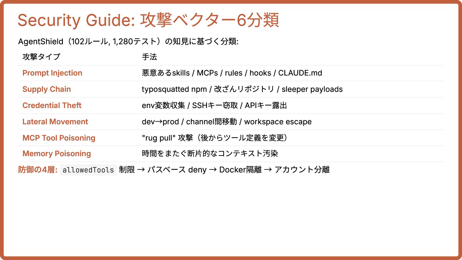 / MCPs / rules / hooks / CLAUDE.md Supply Chain typosquatted npm / 改ざんリポジトリ / sleeper payloads Credential Theft env変数収集 / SSHキー窃取 / APIキー露出 Lateral Movement dev→prod / channel間移動 / workspace escape MCP Tool Poisoning "rug pull" 攻撃(後からツール定義を変更) Memory Poisoning 時間をまたぐ断片的なコンテキスト汚染 防御の4層: allowedTools 制限 → パスベース deny → Docker隔離 → アカウント分離