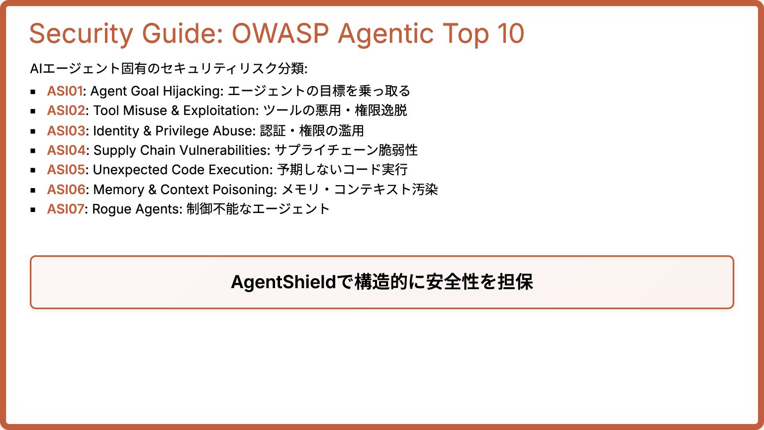 Hijacking: エージェントの目標を乗っ取る ASI02: Tool Misuse & Exploitation: ツールの悪用・権限逸脱 ASI03: Identity & Privilege Abuse: 認証・権限の濫用 ASI04: Supply Chain Vulnerabilities: サプライチェーン脆弱性 ASI05: Unexpected Code Execution: 予期しないコード実行 ASI06: Memory & Context Poisoning: メモリ・コンテキスト汚染 ASI07: Rogue Agents: 制御不能なエージェント AgentShieldで構造的に安全性を担保