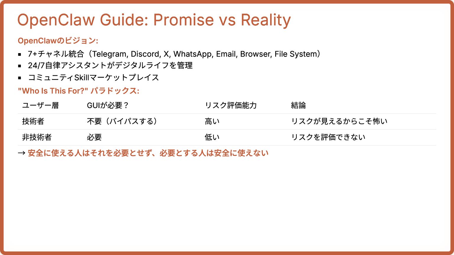 Email, Browser, File System) 24/7自律アシスタントがデジタルライフを管理 コミュニティSkillマーケットプレイス "Who Is This For?" パラドックス: ユーザー層 GUIが必要? リスク評価能力 結論 技術者 不要(バイパスする) 高い リスクが見えるからこそ怖い 非技術者 必要 低い リスクを評価できない → 安全に使える人はそれを必要とせず、必要とする人は安全に使えない