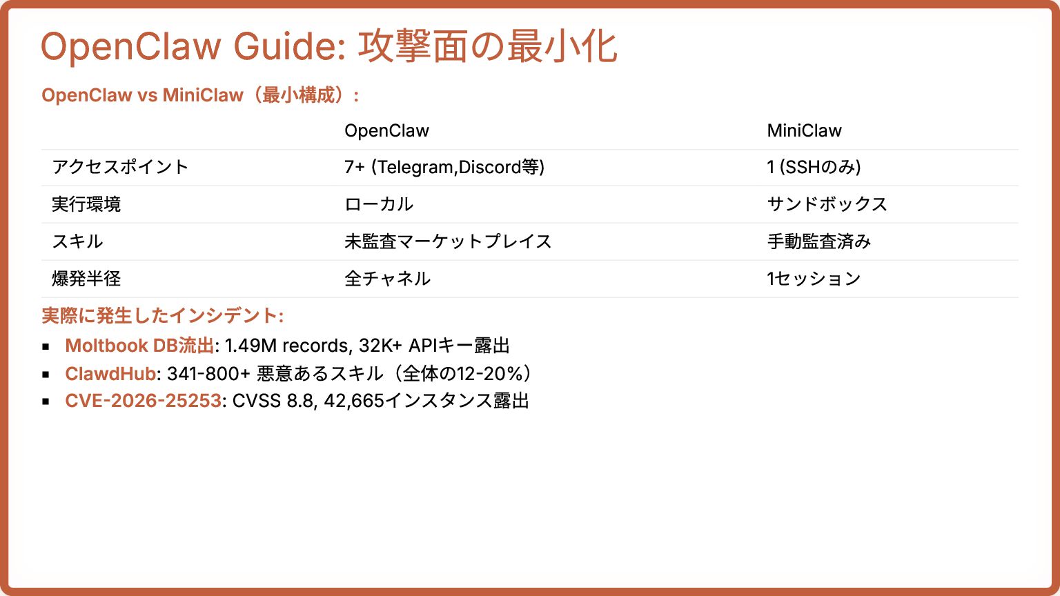 17. OpenClaw Guide: 攻撃面の最小化 OpenClaw vs MiniClaw(最小構成): OpenClaw MiniClaw アクセスポイント 7+