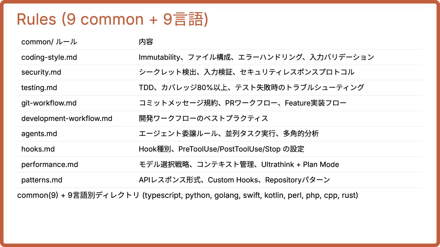 1. Rules (9 common + 9言語) common/ ルール 内容 coding-style.md Immutability、ファイル構成、エラーハンドリング、入力バリデーション