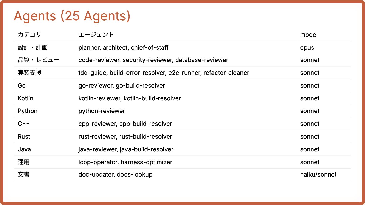 opus 品質・レビュー code-reviewer, security-reviewer, database-reviewer sonnet 実装支援 tdd-guide, build-error-resolver, e2e-runner, refactor-cleaner sonnet Go go-reviewer, go-build-resolver sonnet Kotlin kotlin-reviewer, kotlin-build-resolver sonnet Python python-reviewer sonnet C++ cpp-reviewer, cpp-build-resolver sonnet Rust rust-reviewer, rust-build-resolver sonnet Java java-reviewer, java-build-resolver sonnet 運用 loop-operator, harness-optimizer sonnet 文書 doc-updater, docs-lookup haiku/sonnet