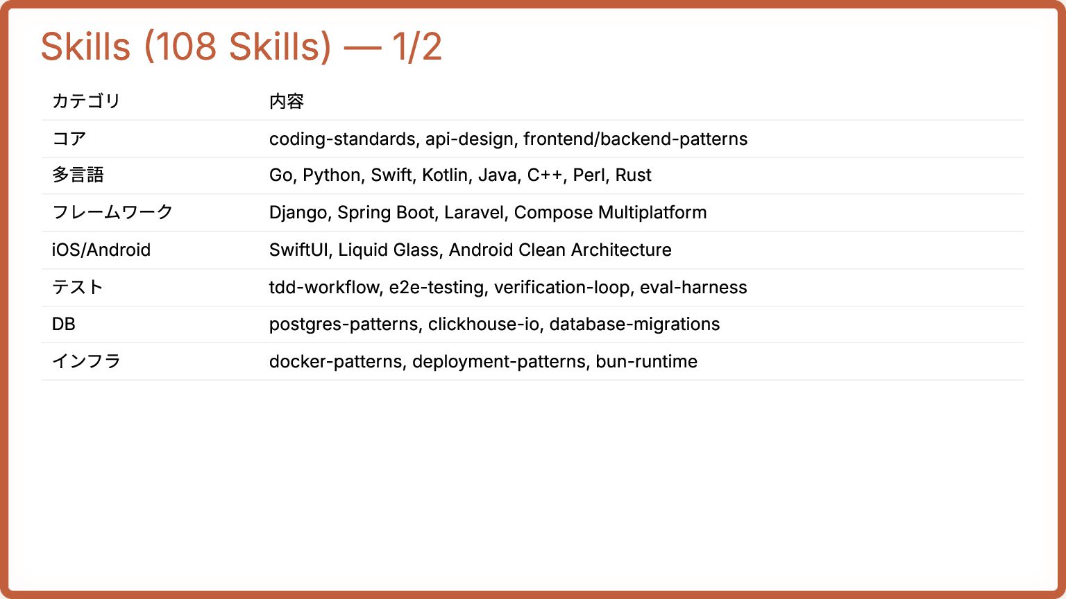 3. Skills (108 Skills) — 1/2 カテゴリ 内容 コア coding-standards, api-design,