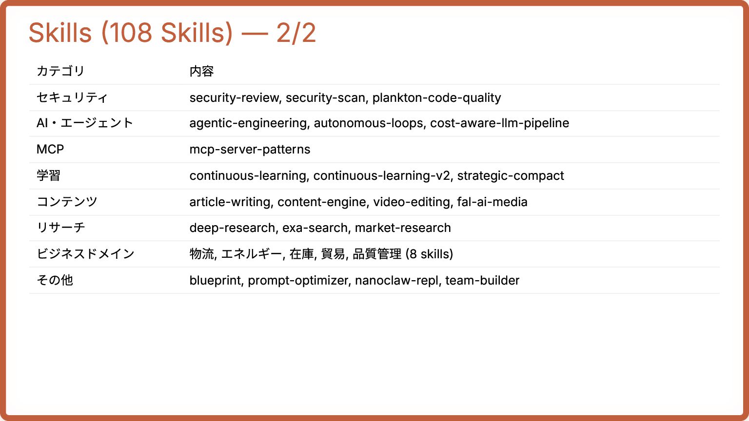 4. Skills (108 Skills) — 2/2 カテゴリ 内容 セキュリティ security-review, security-scan,