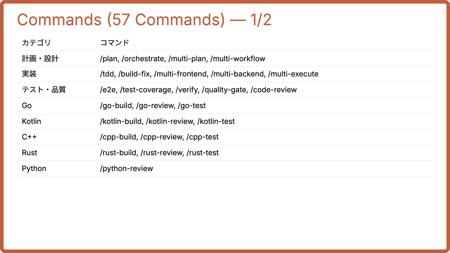 /multi-plan, /multi-workflow 実装 /tdd, /build-fix, /multi-frontend, /multi-backend, /multi-execute テスト・品質 /e2e, /test-coverage, /verify, /quality-gate, /code-review Go /go-build, /go-review, /go-test Kotlin /kotlin-build, /kotlin-review, /kotlin-test C++ /cpp-build, /cpp-review, /cpp-test Rust /rust-build, /rust-review, /rust-test Python /python-review