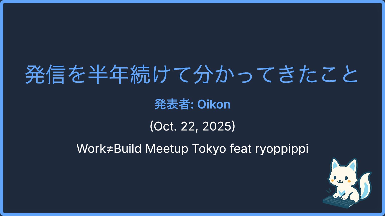 発信を半年続けて分かってきたこと 発表者: Oikon (Oct. 22, 2025) Work≠Build Meetup Tokyo feat