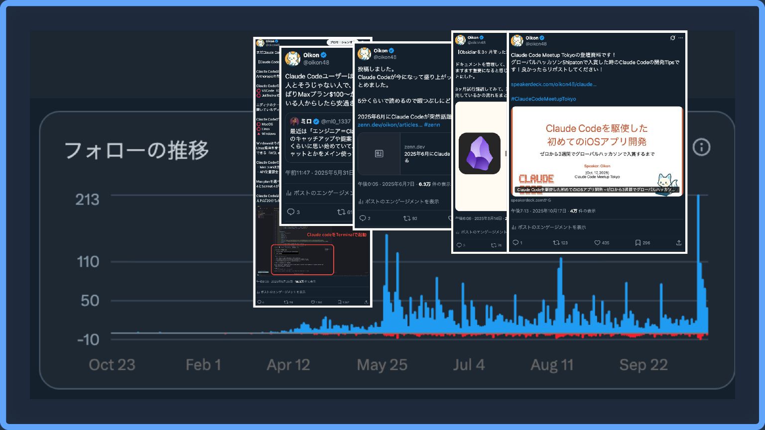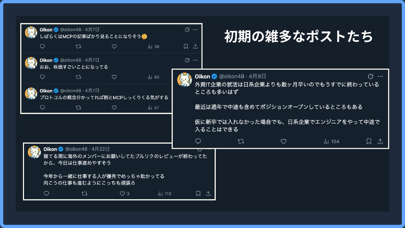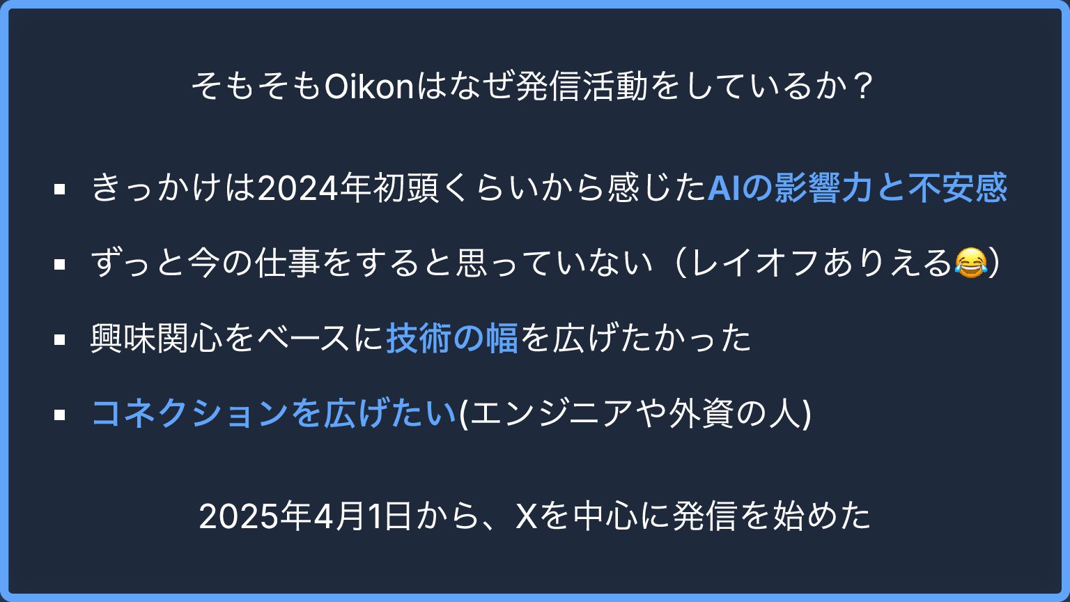 そもそもOikonはなぜ発信活動をしているか? きっかけは2024年初頭くらいから感じたAIの影響力と不安感 ずっと今の仕事をすると思っていない(レイオフありえる😂) 興味関心をベースに技術の幅を広げたかった コネクションを広げたい(エンジニアや外資の人) 2025年4月1日から、Xを中心に発信を始めた