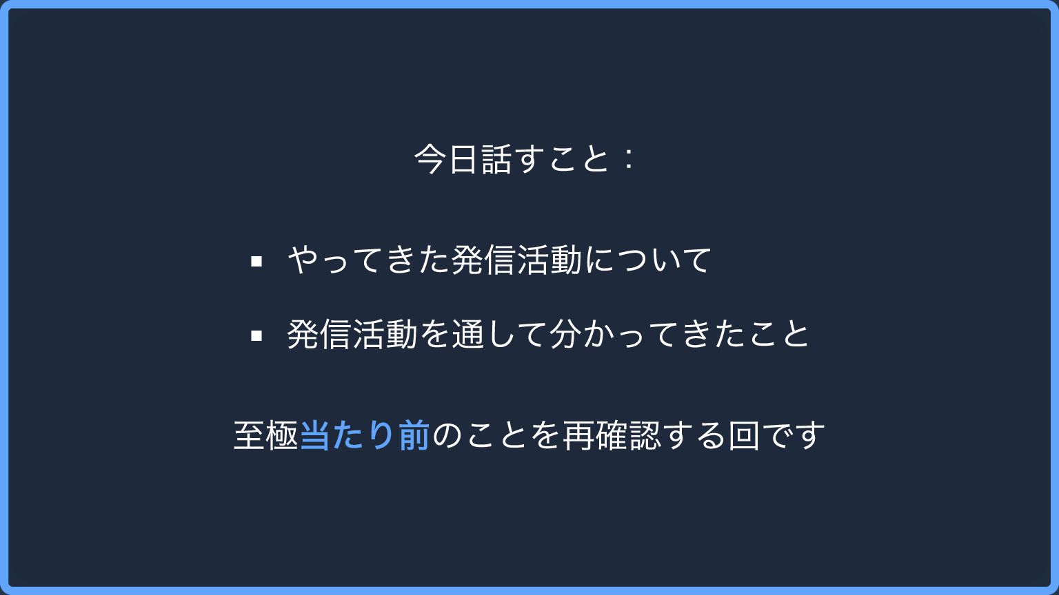 今日話すこと: やってきた発信活動について 発信活動を通して分かってきたこと 至極当たり前のことを再確認する回です