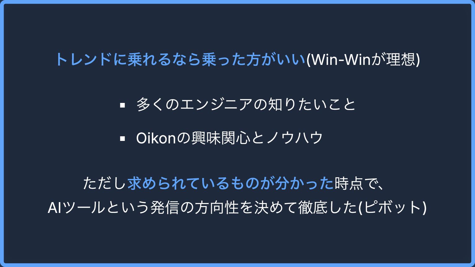 トレンドに乗れるなら乗った方がいい(Win-Winが理想) 多くのエンジニアの知りたいこと Oikonの興味関心とノウハウ ただし求められているものが分かった時点で、 AIツールという発信の方向性を決めて徹底した(ピボット)