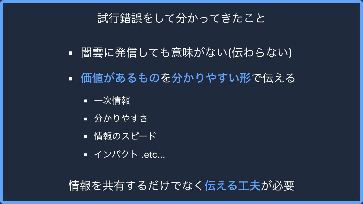 試行錯誤をして分かってきたこと 闇雲に発信しても意味がない(伝わらない) 価値があるものを分かりやすい形で伝える 一次情報 分かりやすさ 情報のスピード インパクト .etc… 情報を共有するだけでなく伝える工夫が必要