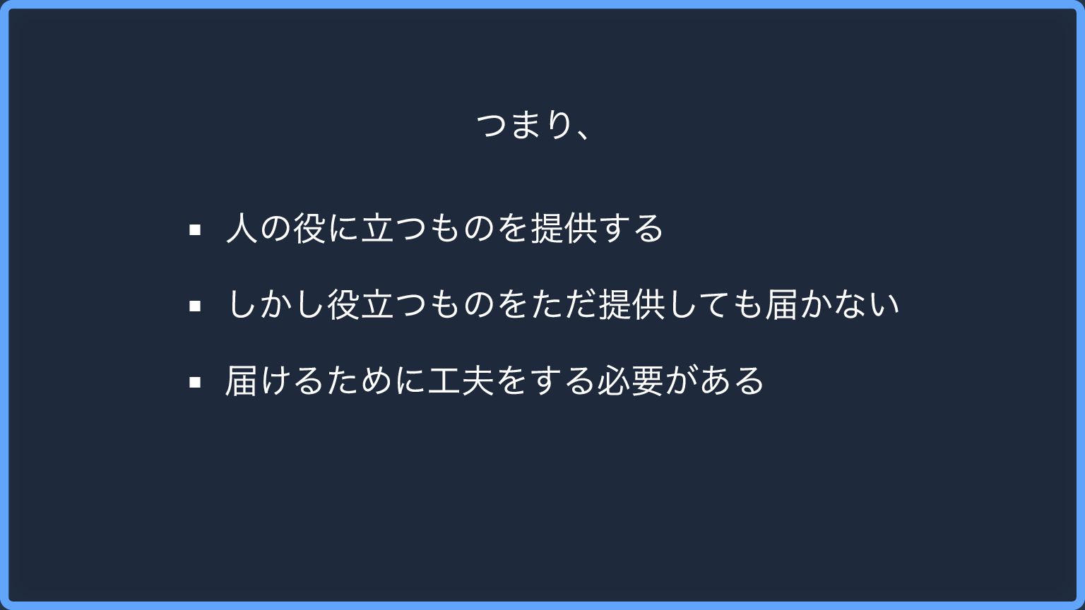 つまり、 人の役に立つものを提供する しかし役立つものをただ提供しても届かない 届けるために工夫をする必要がある