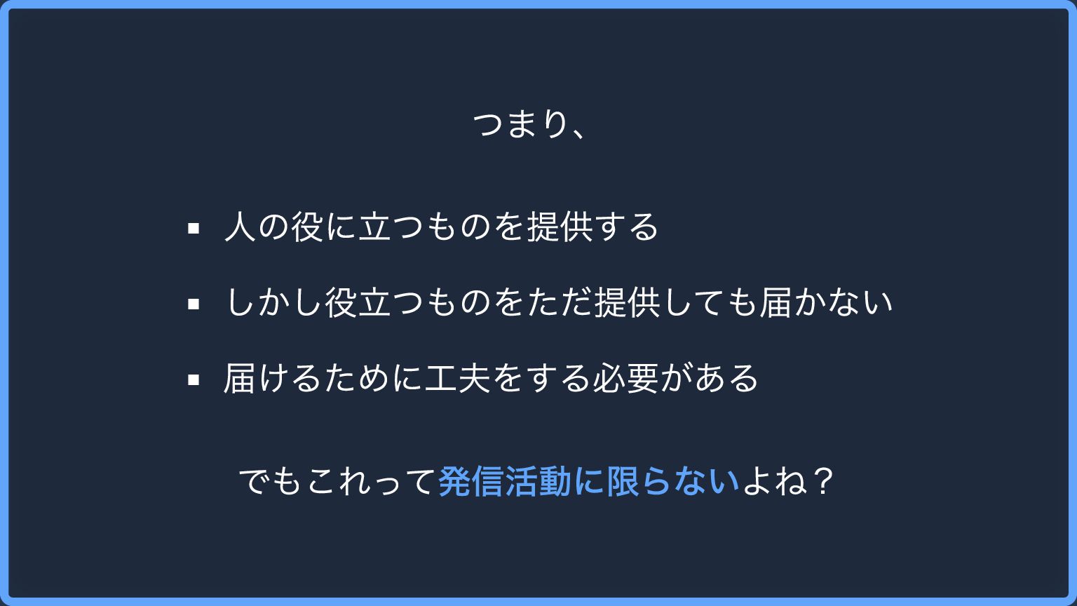 つまり、 人の役に立つものを提供する しかし役立つものをただ提供しても届かない 届けるために工夫をする必要がある でもこれって発信活動に限らないよね?