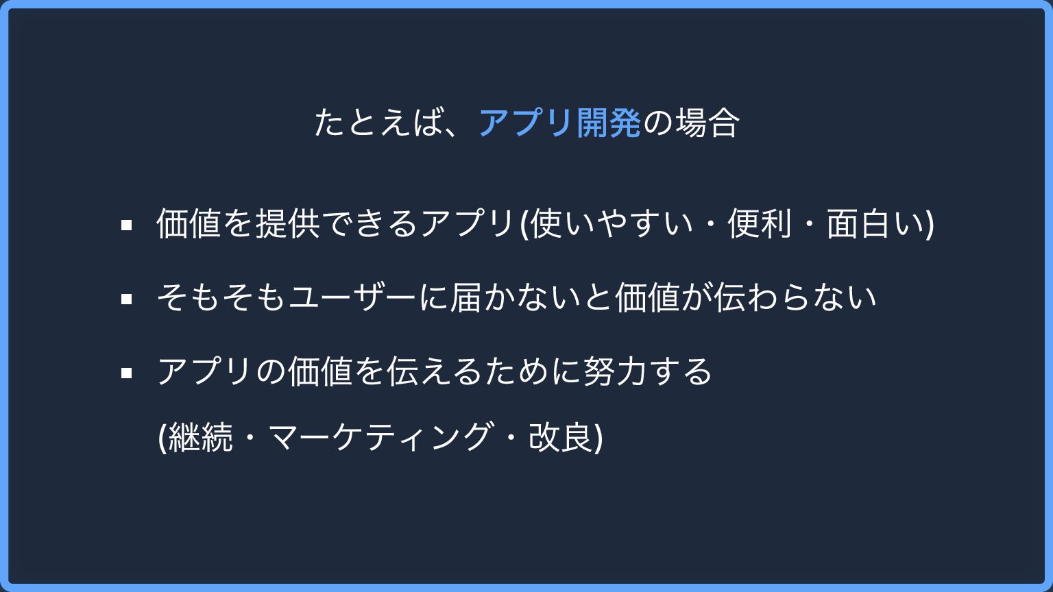 たとえば、アプリ開発の場合 価値を提供できるアプリ(使いやすい・便利・面白い) そもそもユーザーに届かないと価値が伝わらない アプリの価値を伝えるために努力する (継続・マーケティング・改良)