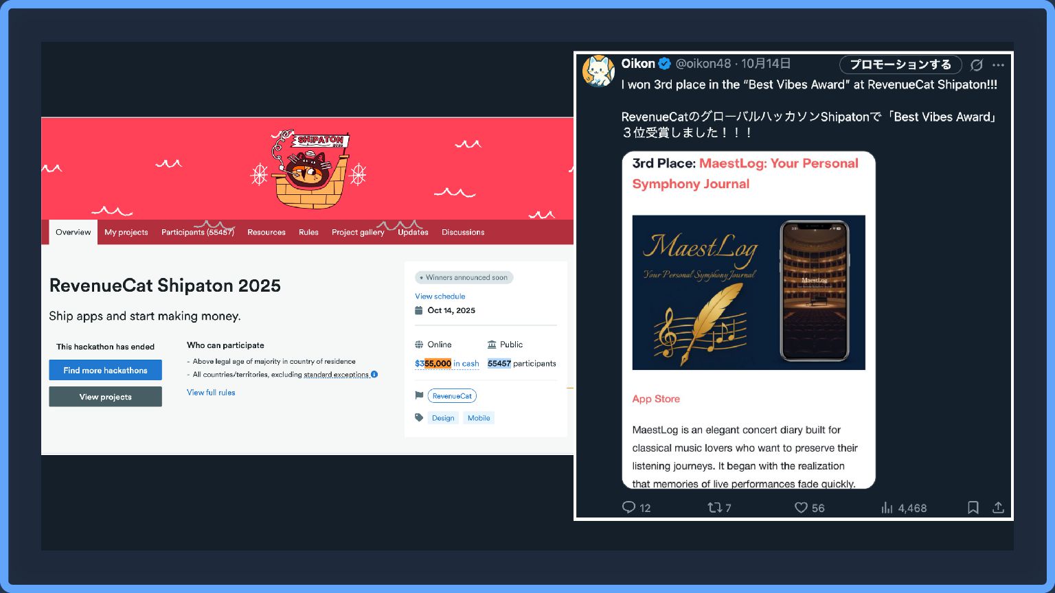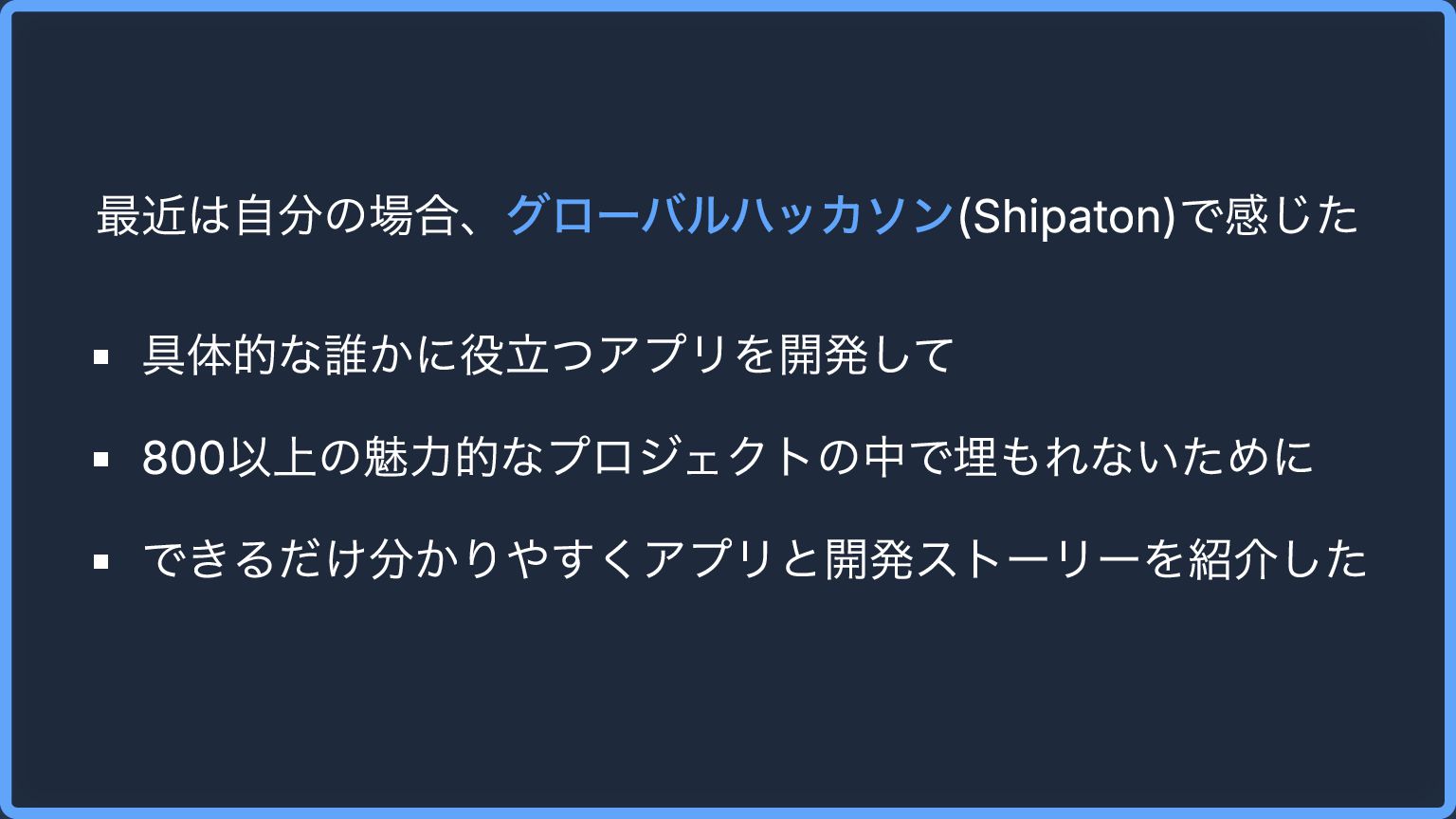 最近は自分の場合、グローバルハッカソン(Shipaton)で感じた 具体的な誰かに役立つアプリを開発して 800以上の魅力的なプロジェクトの中で埋もれないために できるだけ分かりやすくアプリと開発ストーリーを紹介した