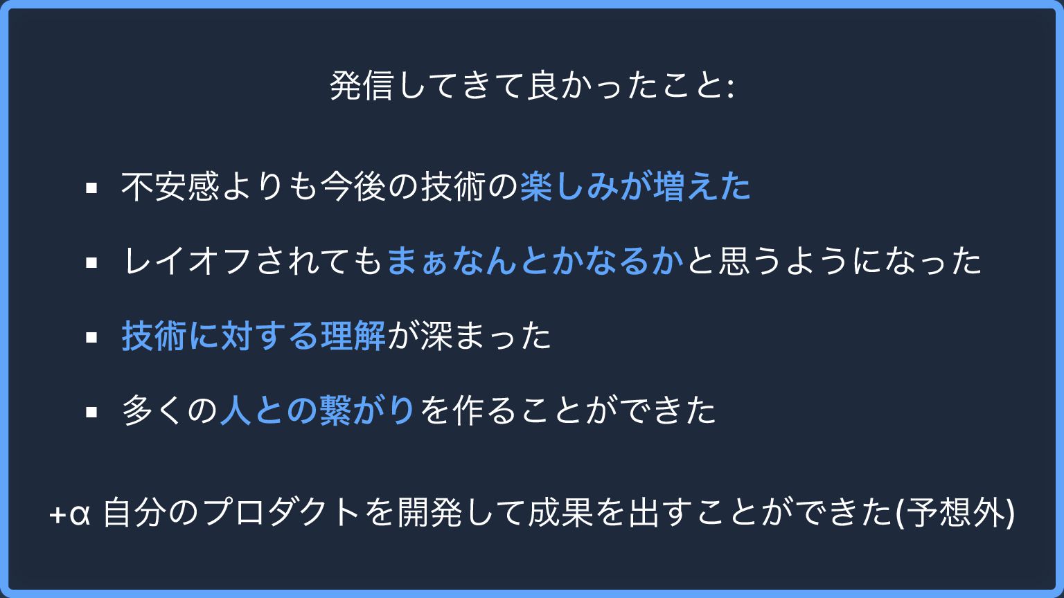 発信してきて良かったこと: 不安感よりも今後の技術の楽しみが増えた レイオフされてもまぁなんとかなるかと思うようになった 技術に対する理解が深まった 多くの人との繋がりを作ることができた +α 自分のプロダクトを開発して成果を出すことができた(予想外)