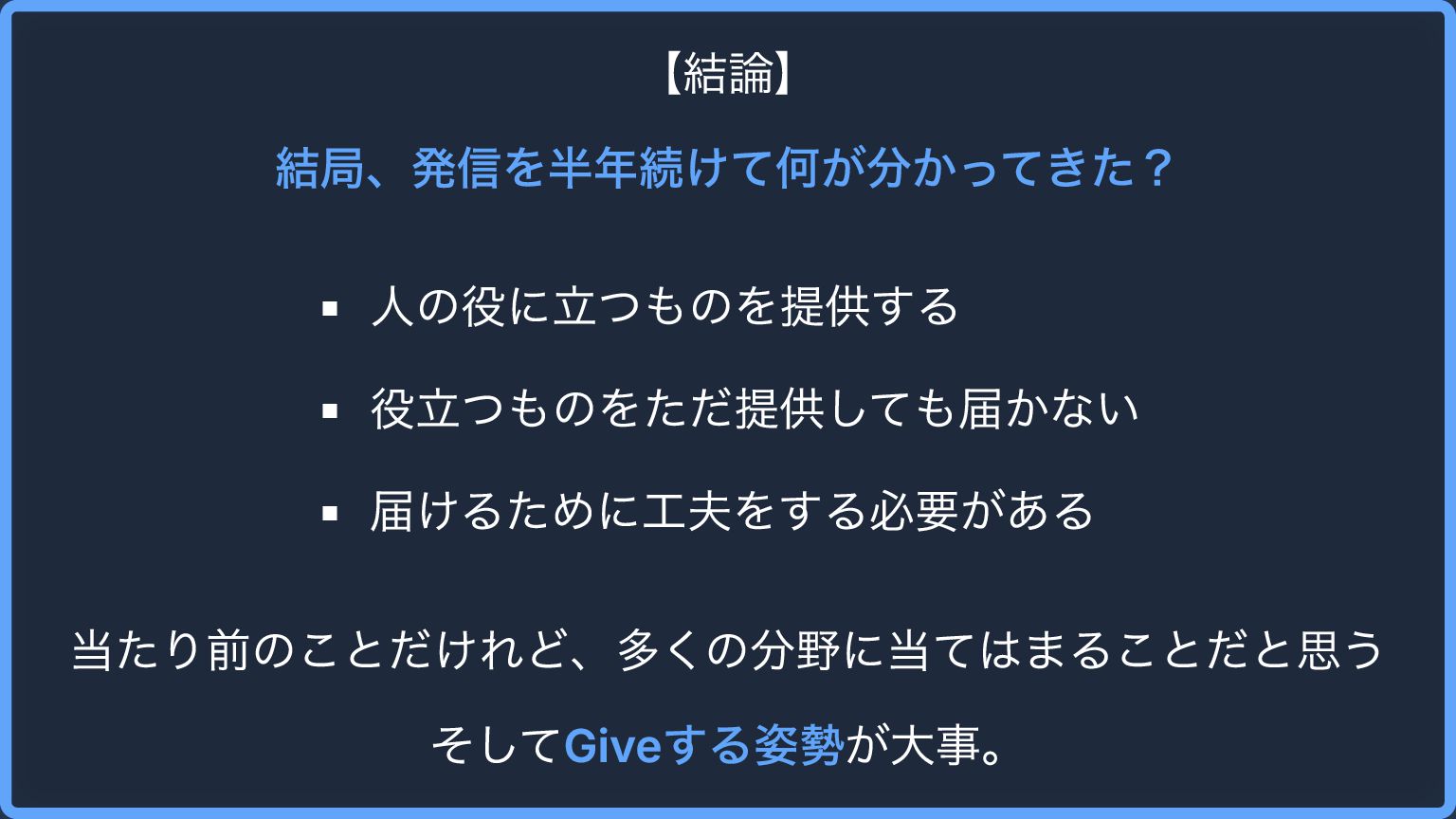 【結論】 結局、発信を半年続けて何が分かってきた? 人の役に立つものを提供する 役立つものをただ提供しても届かない 届けるために工夫をする必要がある 当たり前のことだけれど、多くの分野に当てはまることだと思う そしてGiveする姿勢が大事。