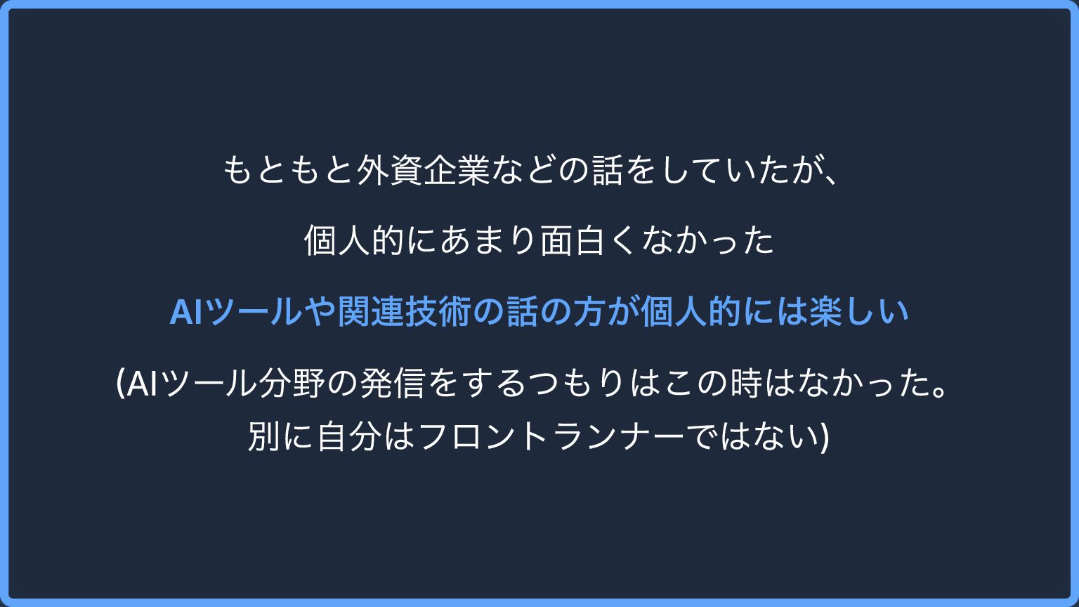 もともと外資企業などの話をしていたが、 個人的にあまり面白くなかった AIツールや関連技術の話の方が個人的には楽しい (AIツール分野の発信をするつもりはこの時はなかった。 別に自分はフロントランナーではない)