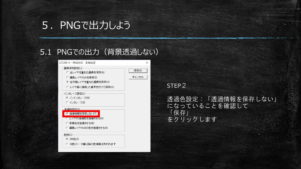 5.PNGで出力しよう 5.1 PNGでの出力(背景透過しない) STEP2 透過色設定:「透過情報を保存しない」 になっていることを確認して 「保存」 をクリックします