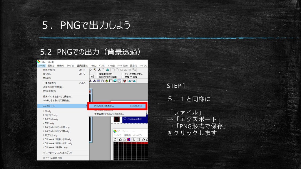 5.PNGで出力しよう 5.2 PNGでの出力(背景透過) STEP1 5.1と同様に 「ファイル」 →「エクスポート」 →「PNG形式で保存」 をクリックします