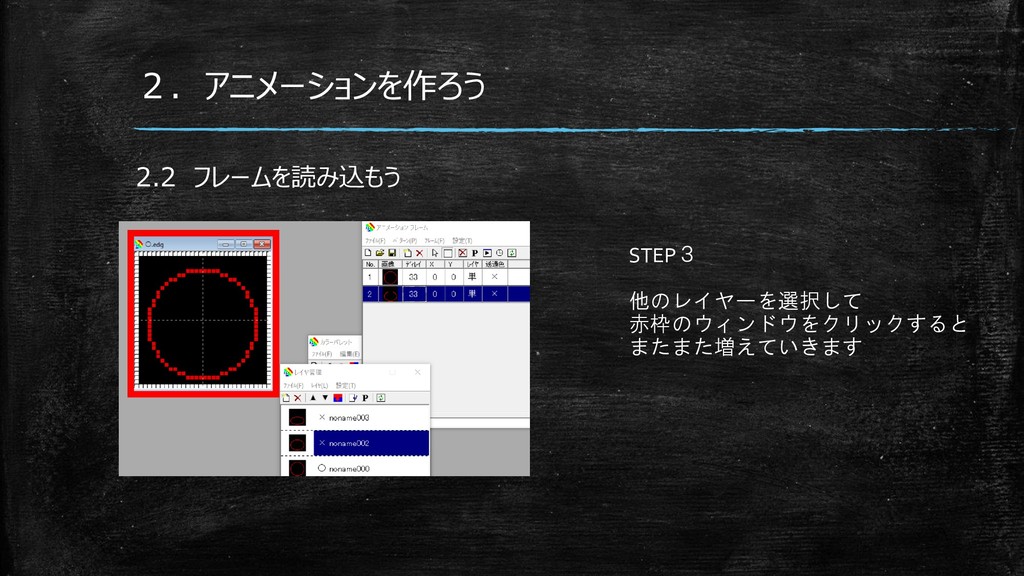 2.アニメーションを作ろう 2.2 フレームを読み込もう STEP3 他のレイヤーを選択して 赤枠のウィンドウをクリックすると またまた増えていきます