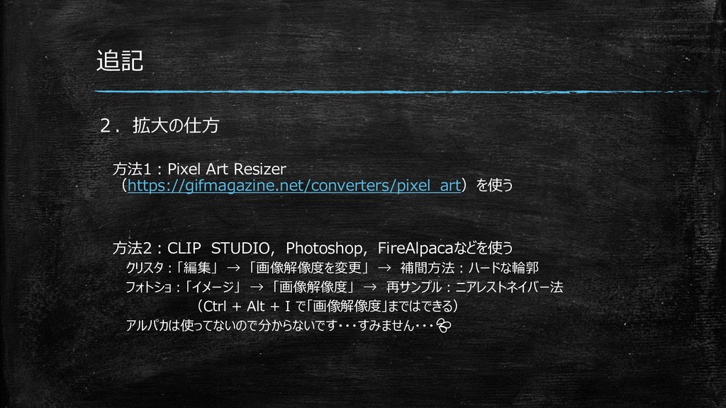 追記 2.拡大の仕方 ドット絵は普通に拡大すると 輪郭がぼやけてしまいます 普通の とある方法