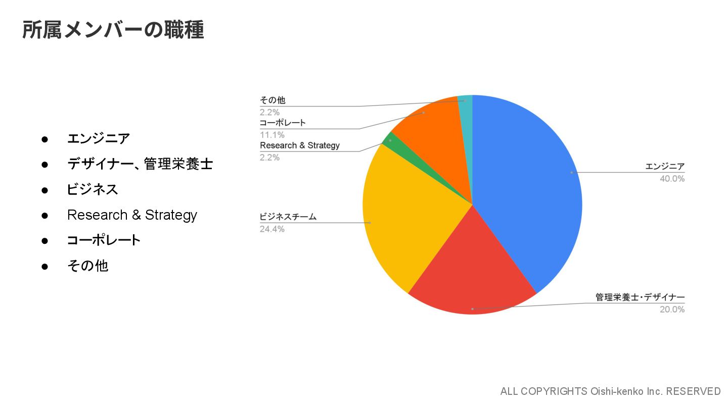 ALL COPYRIGHTS Oishi-kenko Inc. RESERVED 所属メンバーの職種 • エンジニア • デザイナー、管理栄養士