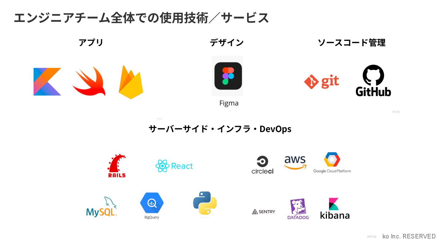 ALL COPYRIGHTS Oishi-kenko Inc. RESERVED アプリ デザイン ソースコード管理 サーバーサイド‧インフラ‧DevOps エンジニアチーム全体での使⽤技術∕サービス
