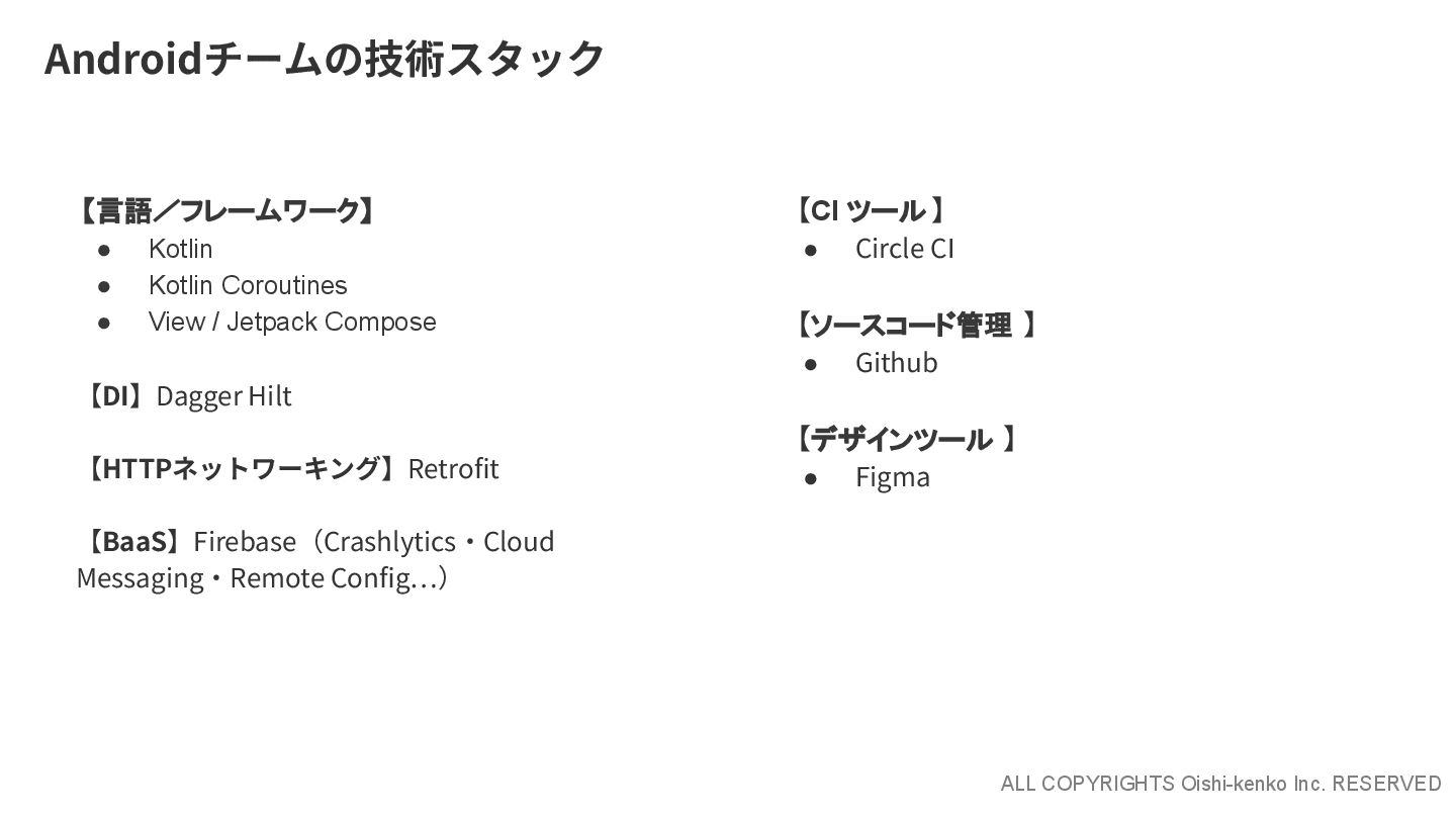 ALL COPYRIGHTS Oishi-kenko Inc. RESERVED Androidチームの技術スタック 【言語/フレームワーク】 • Kotlin •