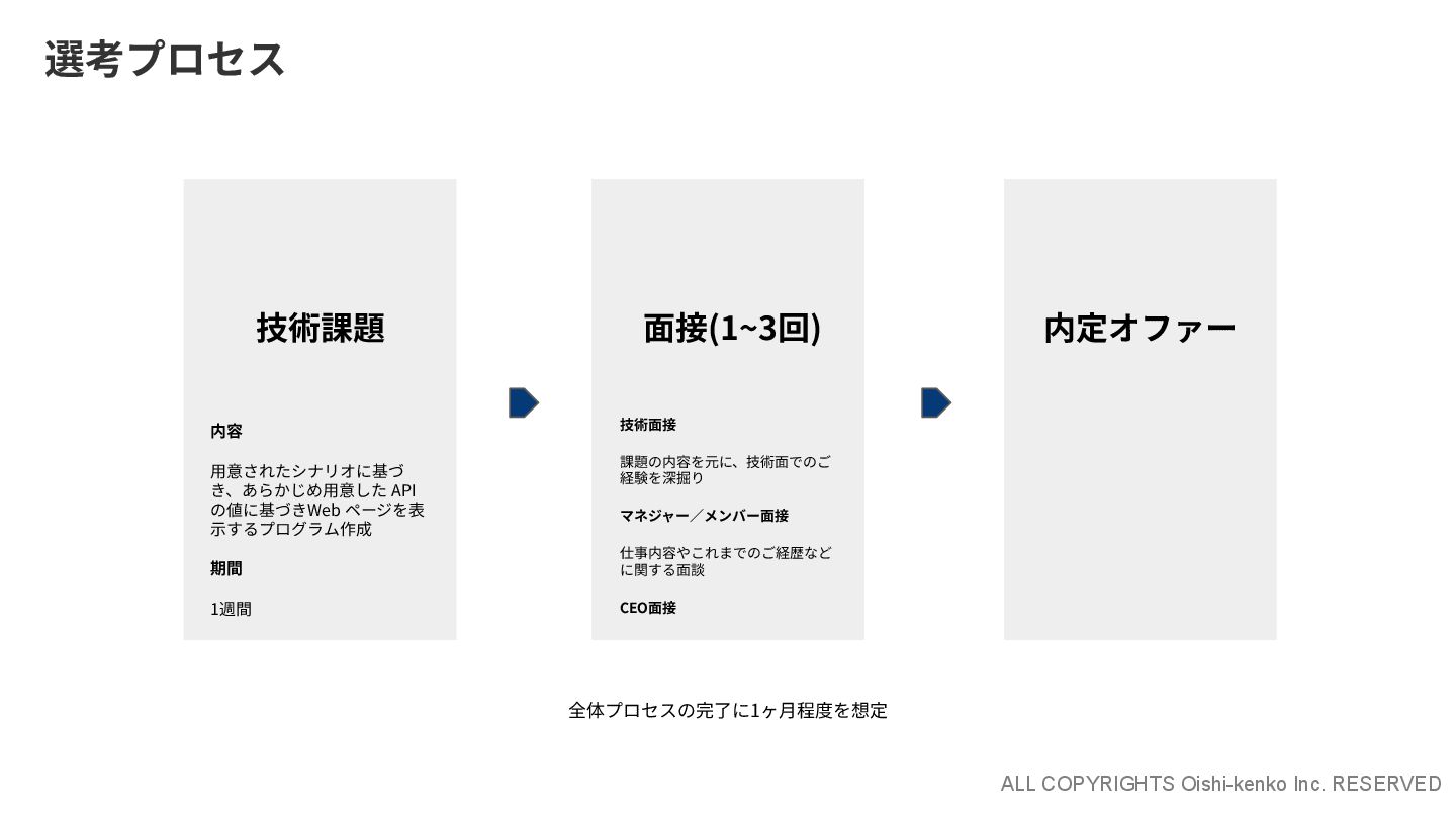 ALL COPYRIGHTS Oishi-kenko Inc. RESERVED 選考プロセス 技術課題 内容 ⽤意されたシナリオに基づ き、あらかじめ⽤意した