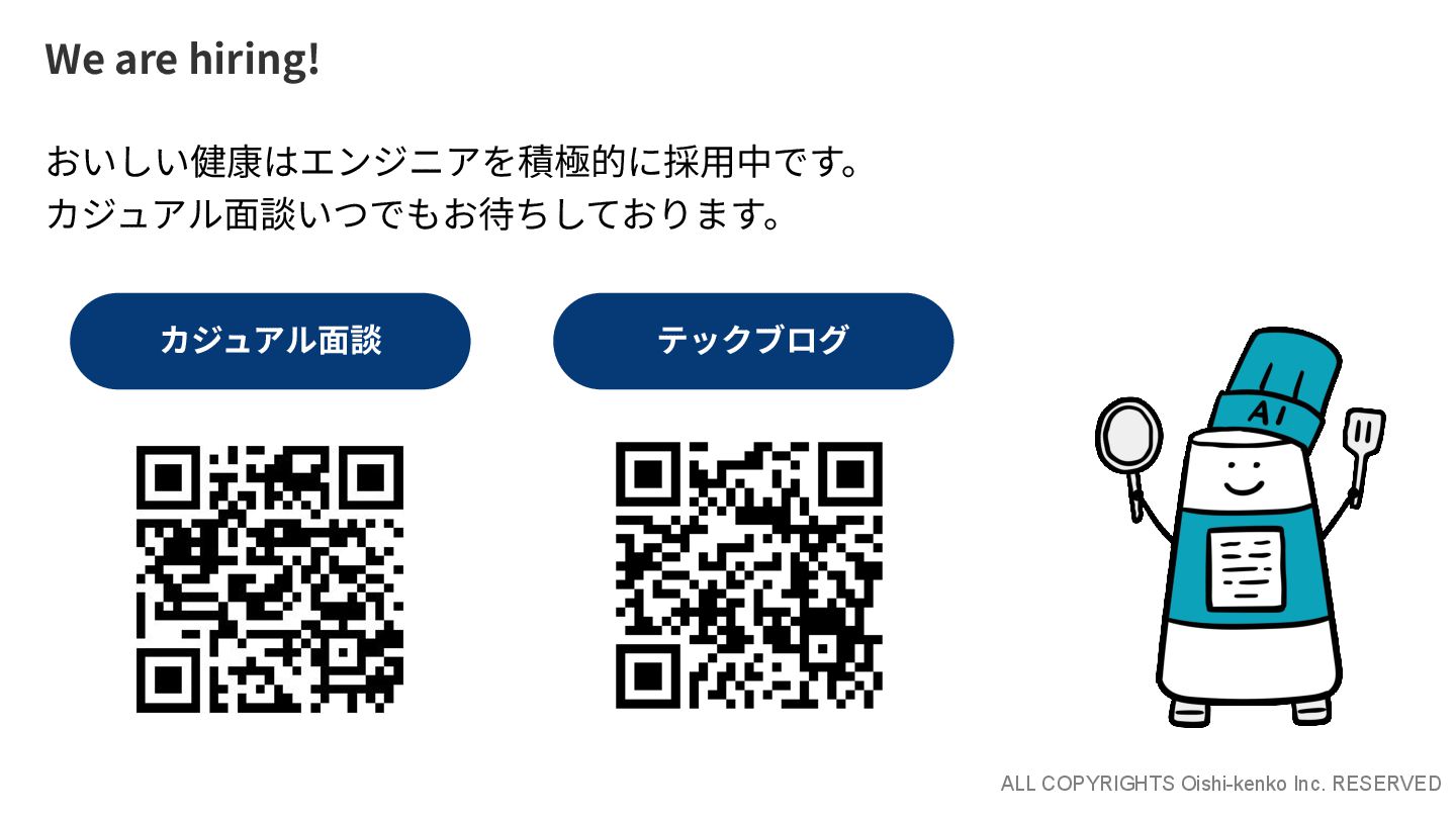 ALL COPYRIGHTS Oishi-kenko Inc. RESERVED We are hiring! カジュアル⾯談 おいしい健康はエンジニアを積極的に採⽤中です。