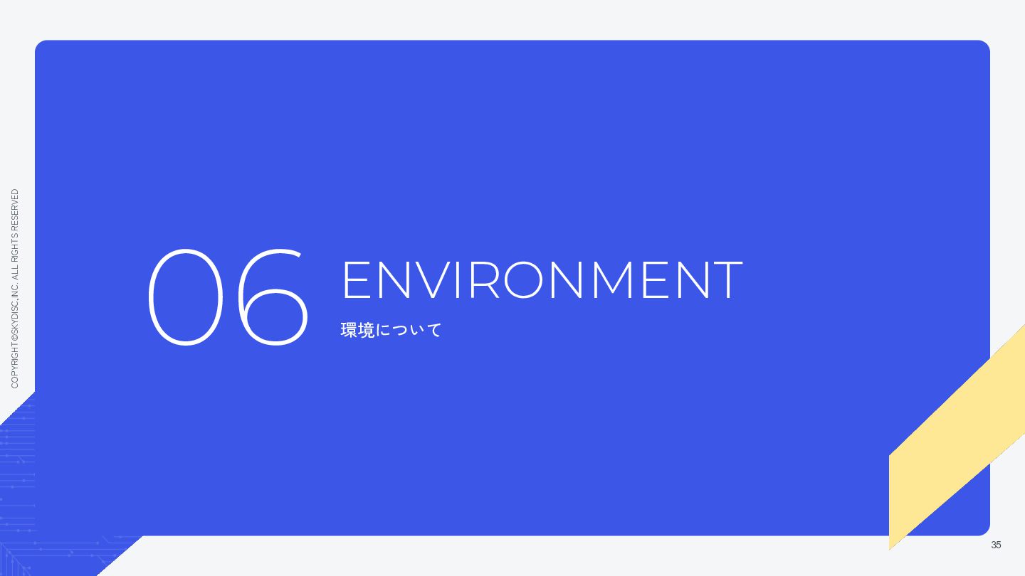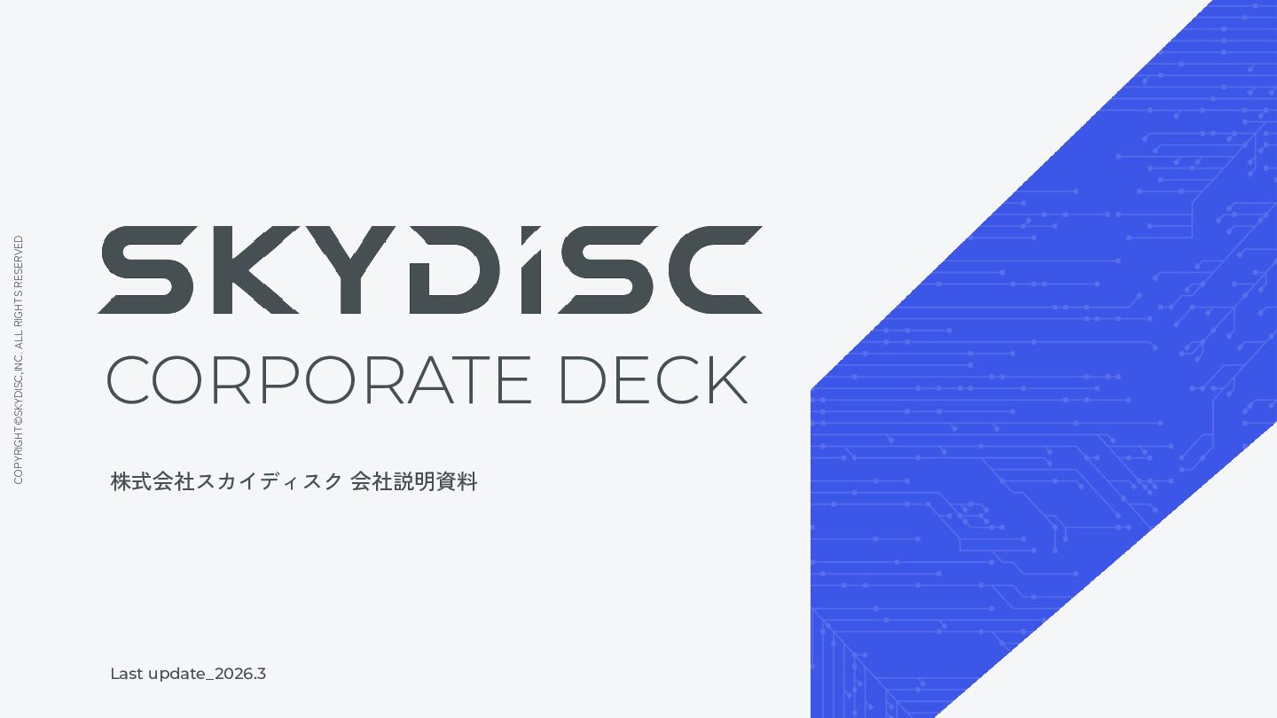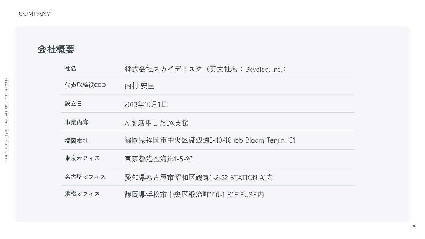 2. COPYRIGHT©SKYDISC,INC. ALL RIGHTS RESERVED 会社概要 4 COMPANY 社名 株式会社スカイディスク(英文社名:Skydisc, Inc.)