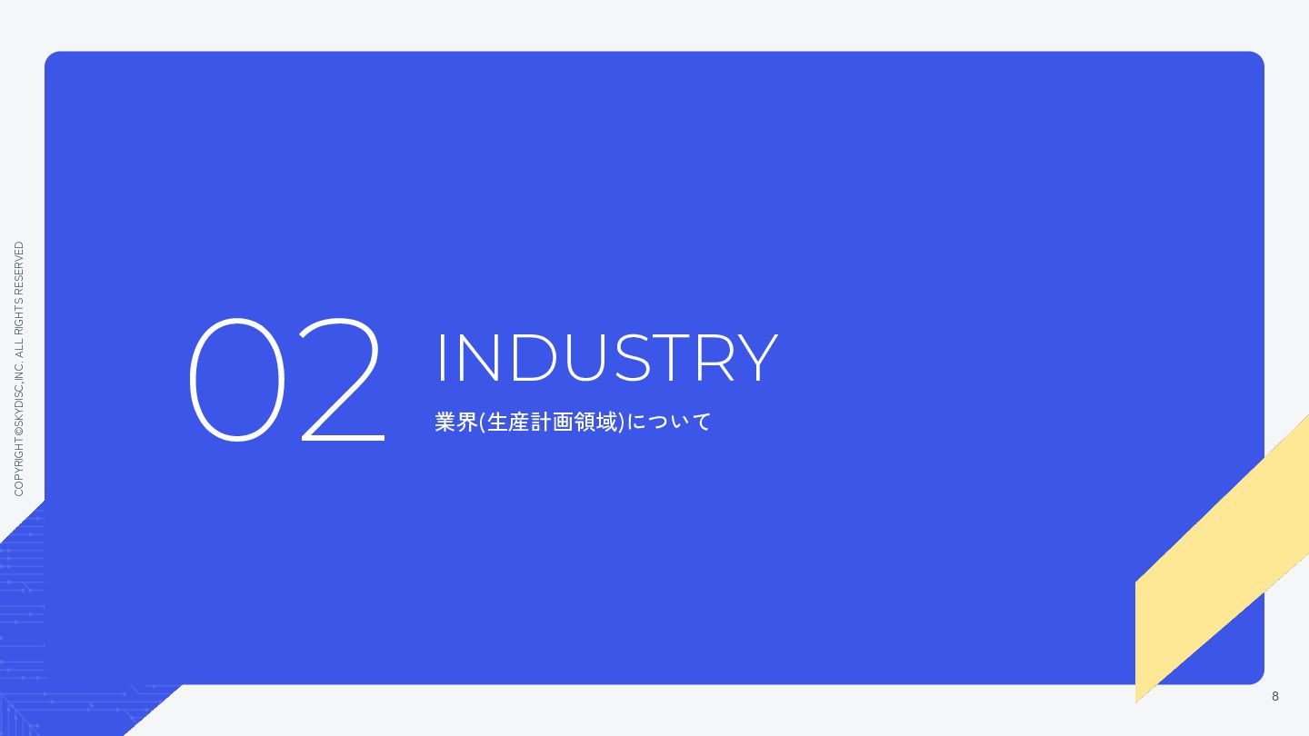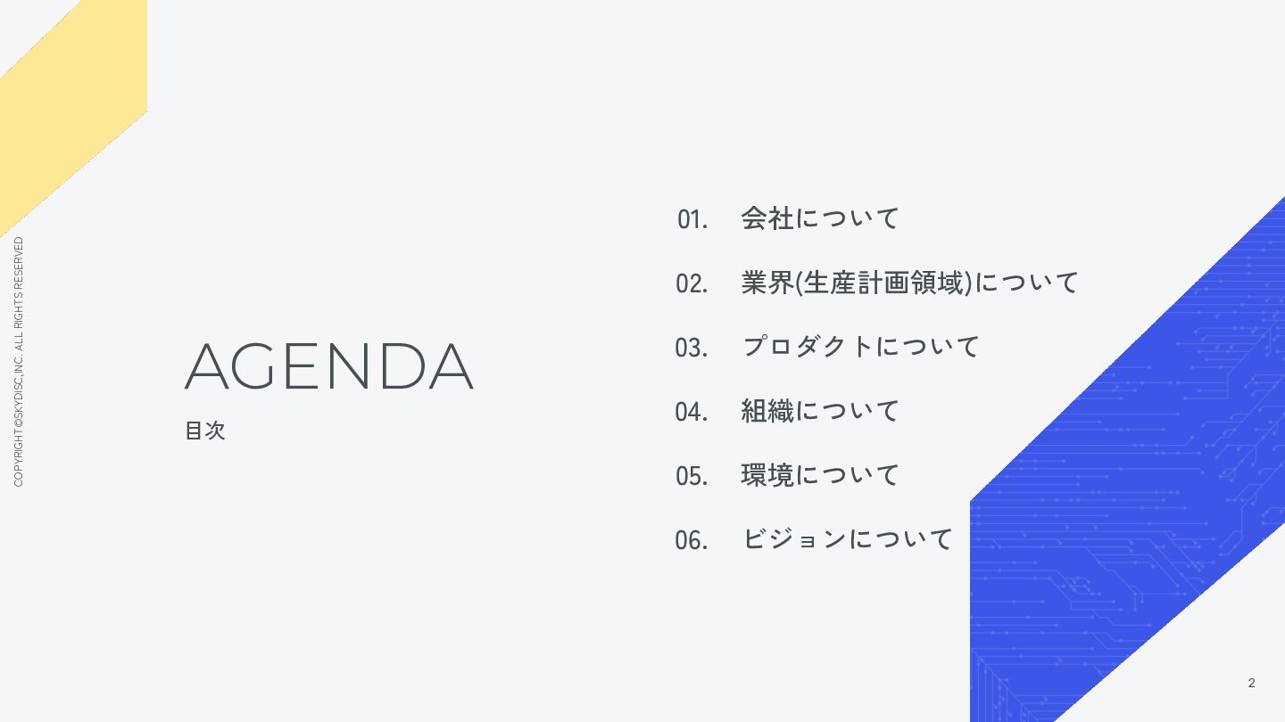 1. COPYRIGHT©SKYDISC,INC. ALL RIGHTS RESERVED AGENDA 目次 01. 会社について 02. 業界(生産計画領域)について
