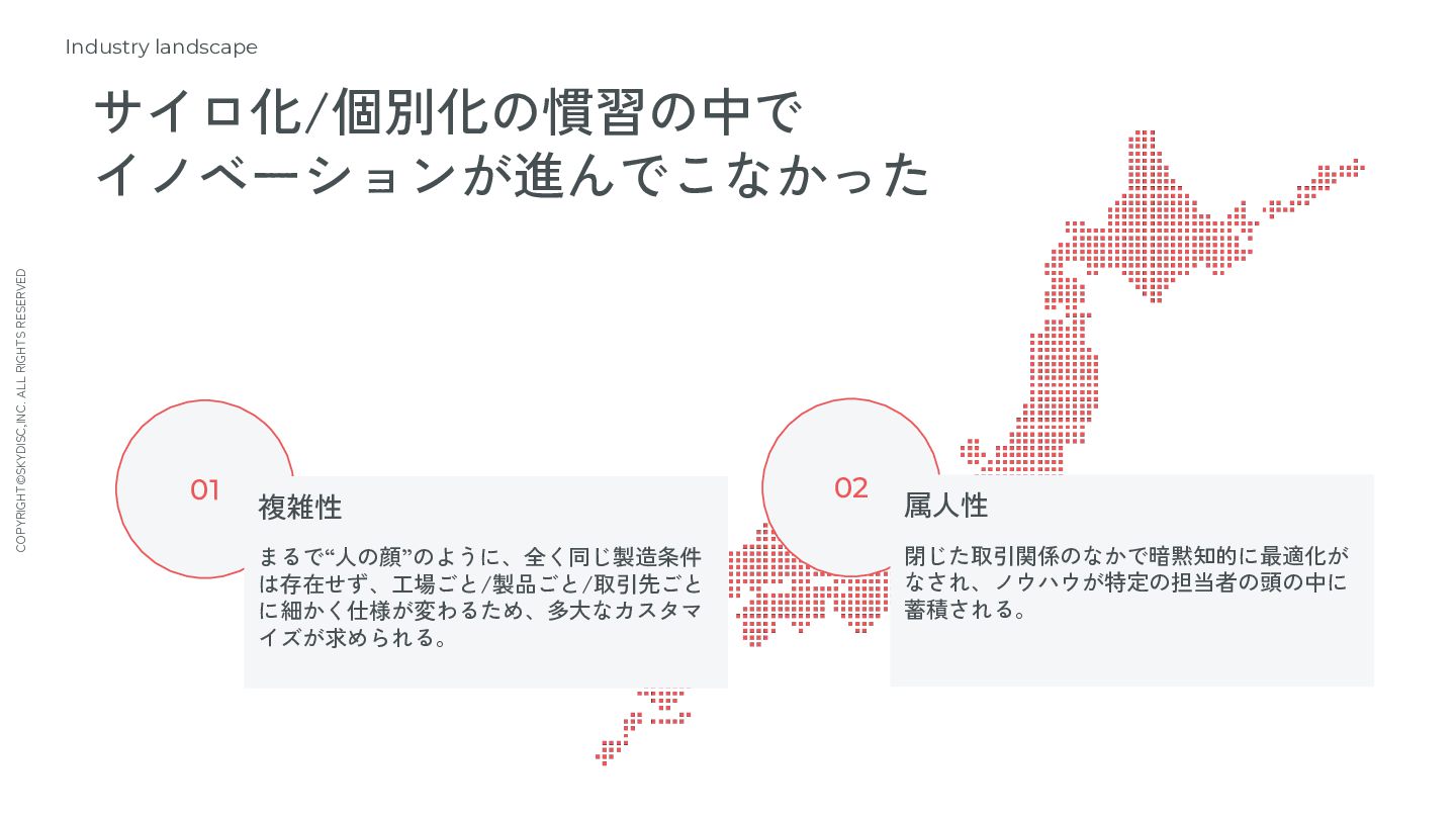 複雑性 まるで“人の顔”のように、全く同じ製造条件 は存在せず、工場ごと/製品ごと/取引先ごと に細かく仕様が変わるため、多大なカスタマ イズが求められる。 02 属人性 閉じた取引関係のなかで暗黙知的に最適化が なされ、ノウハウが特定の担当者の頭の中に 蓄積される。