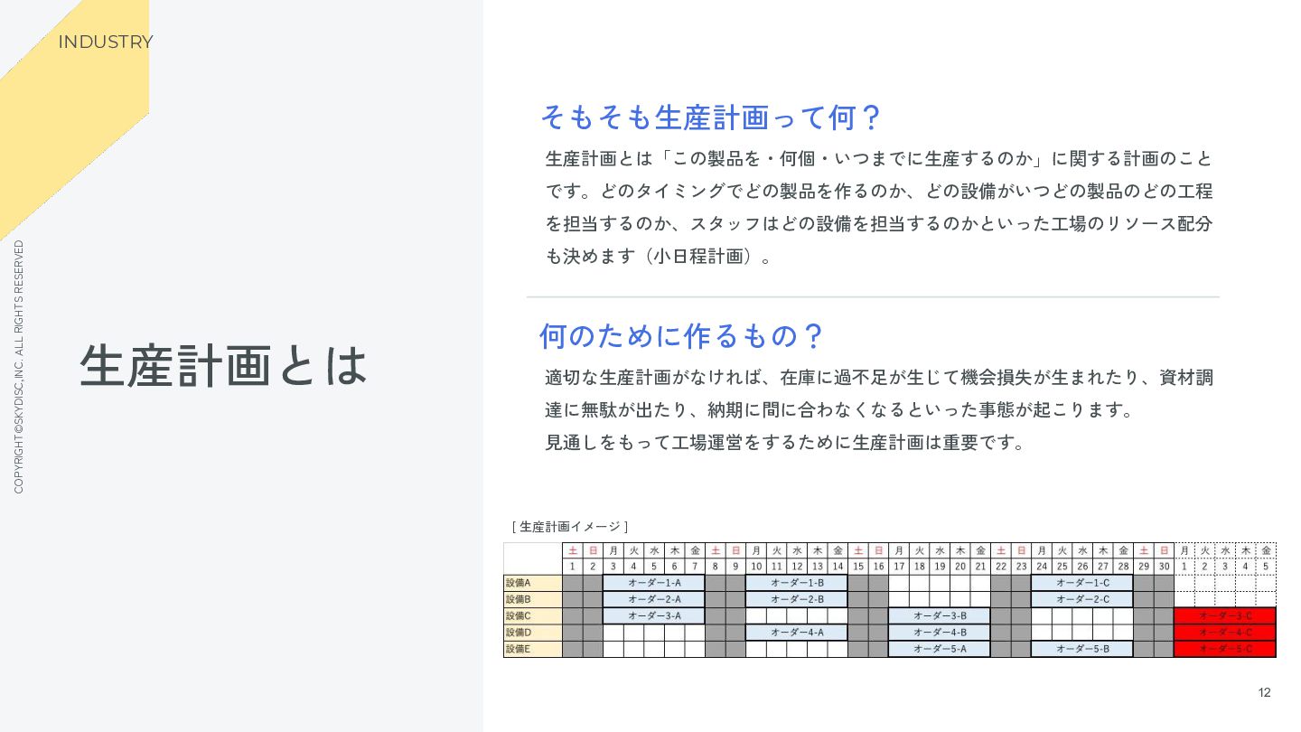 9. COPYRIGHT©SKYDISC,INC. ALL RIGHTS RESERVED 12 12 生産計画とは INDUSTRY そもそも生産計画って何? 生産計画とは「この製品を・何個・いつまでに生産するのか」に関する計画のこと