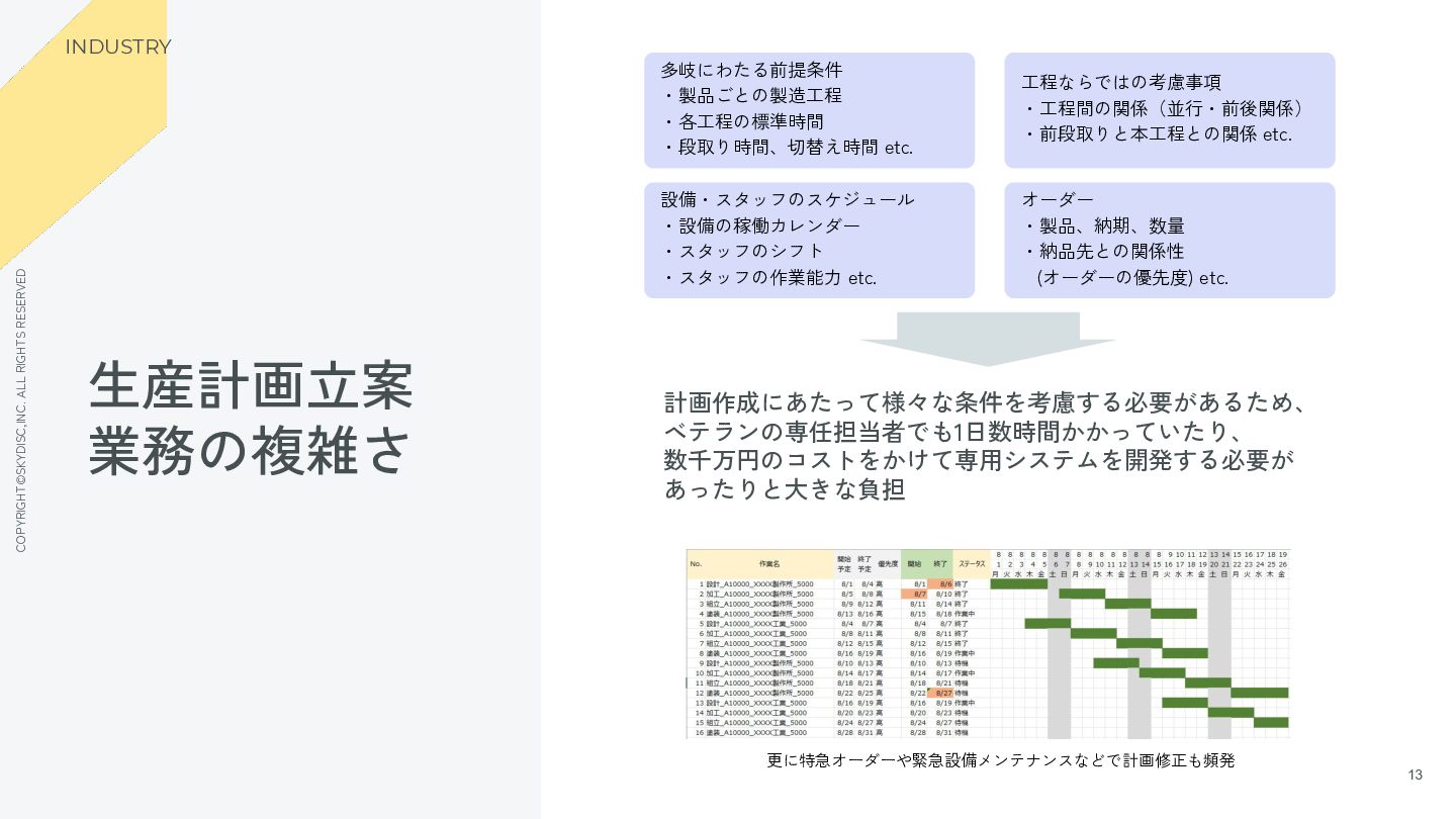10. COPYRIGHT©SKYDISC,INC. ALL RIGHTS RESERVED 13 13 生産計画立案 業務の複雑さ INDUSTRY 多岐にわたる前提条件
