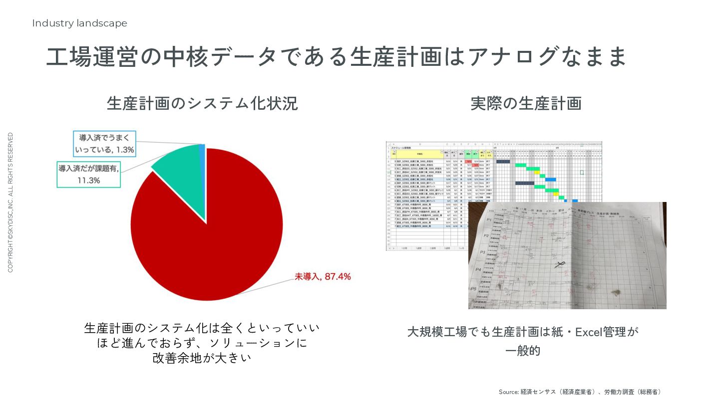 11. COPYRIGHT©SKYDISC,INC. ALL RIGHTS RESERVED Industry landscape 工場運営の中核データである生産計画はアナログなまま Source: 経済センサス(経済産業省)、労働力調査(総務省) 14