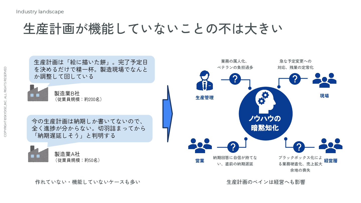 12. COPYRIGHT©SKYDISC,INC. ALL RIGHTS RESERVED 15 Industry landscape 生産計画が機能していないことの不は大きい ノウハウの 暗黙知化