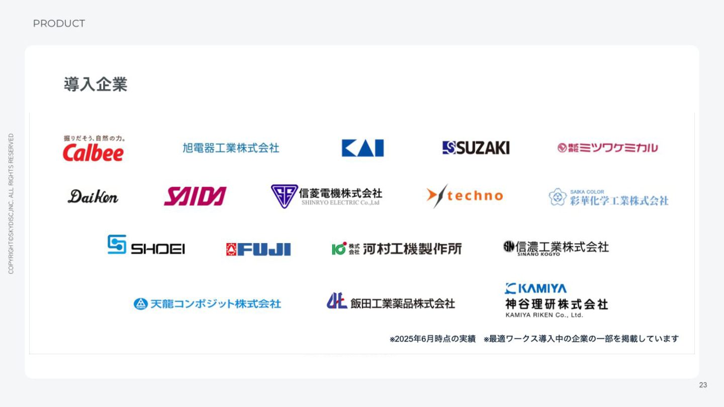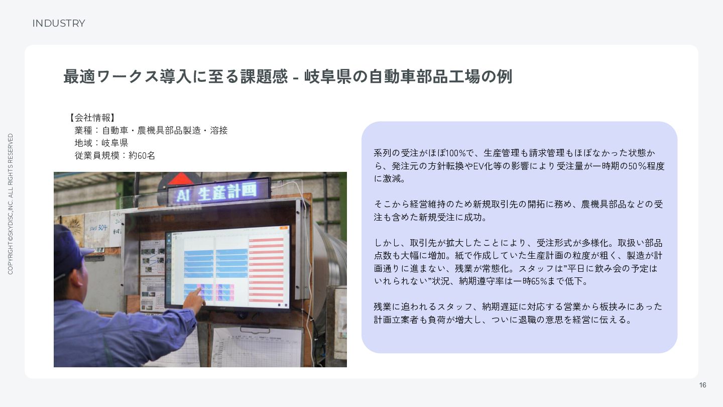 13. COPYRIGHT©SKYDISC,INC. ALL RIGHTS RESERVED 16 最適ワークス導入に至る課題感 - 岐阜県の自動車部品工場の例 INDUSTRY 【会社情報】