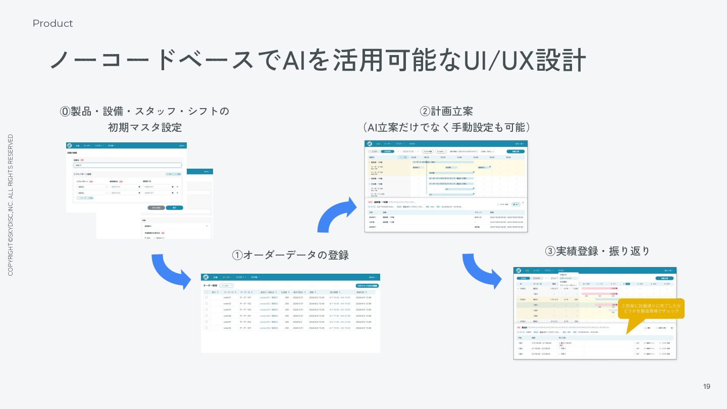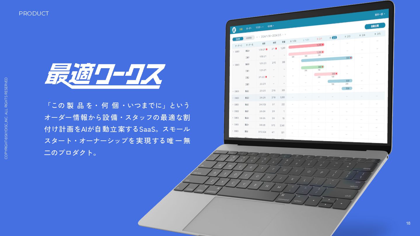 個 ・いつまでに」という オーダー情報から設備・スタッフの最適な割 付け計画をAIが自動立案するSaaS。スモール スタート・オーナーシップを実 現する唯 一 無 二のプロダクト。 PRODUCT