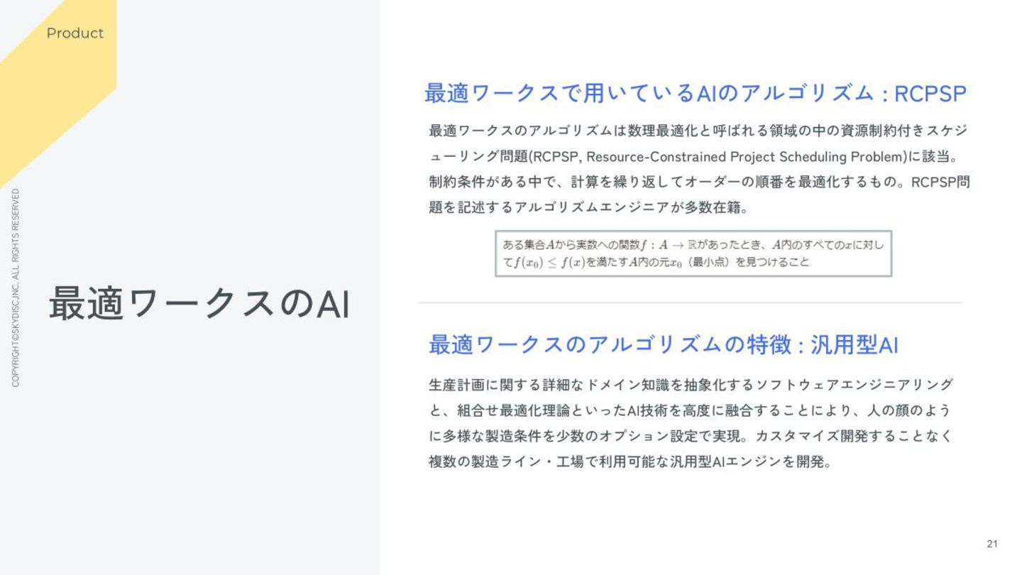 その中で「生産計画」という製造業DXにおける最重要課題のひとつに触れ、 「最適ワークス」という人生を賭けるに足るプロダクトアイデアを生み出せたことは 非常に幸運なことです。 日本の製造業とともに、世界へ。 数年前には描けなかった、そんなワクワクする未来を実現するために、 一人でも多くの仲間と出会いたいと思っています。 COMPANY 日本の製造業とともに、世界へ。 COPYRIGHT©SKYDISC,INC. ALL RIGHTS RESERVED 株式会社スカイディスク 代表取締役CEO 内村安里